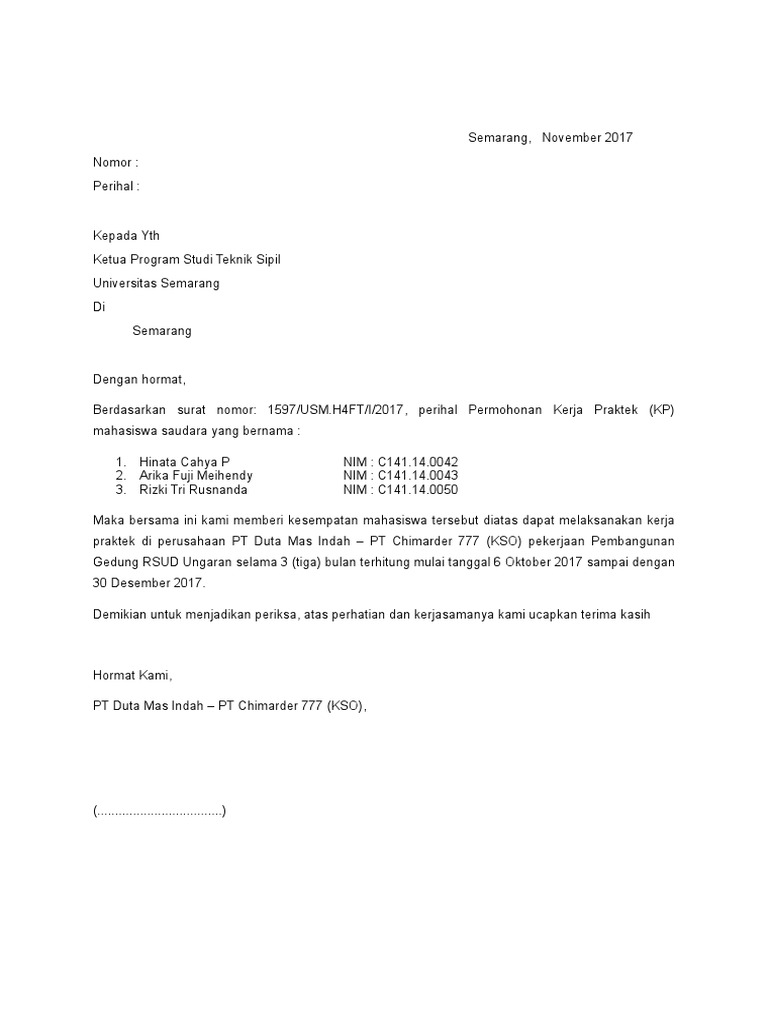 Contoh Surat Balasan Pkl Dari Perusahaan from 0.academia-photos.com Demikian surat balasan ini dibuat untuk dipergunakan sebagaimana mestinya. Contoh surat balasan untuk pkl psg prakerin smk beritaku. Dengan hormat, sehubungan dengan adanya program praktek kerja lapangan (pkl) mandiri yang dilaksanakan mahasiswa/mahasiswi dcc lampung kampus metro, yang dimulai bulan mei sampai. Contoh surat contoh surat balasan pkl smk. Contoh surat balasan pkl 2019 kumpulan contoh surat dan proposal. Meskipun begitu surat resmi tidak harus selalu dibuat oleh kelompok, bisa juga dibuat oleh individu. Contoh surat balasan permohonan kredit surat pimpinan the rules. Di kantor sinode gmim mulai pkl.08.00 (pendaftaran peserta).